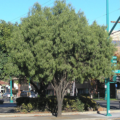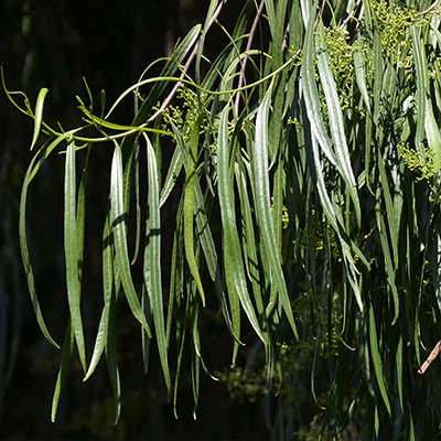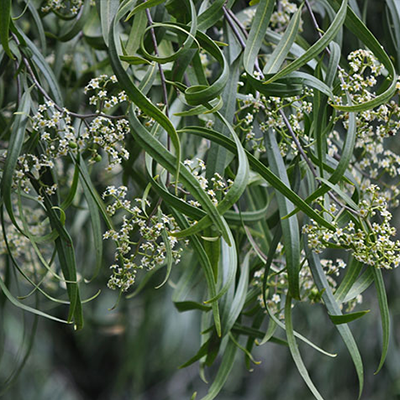 The Australian Willow (Geijera parviflora) is a very attractive evergreen composed of strong, wind-resistant branches that weeps as it matures. It’s thin, three to six-inch long, olive green leaves droop from its branches giving it a similar look and effect of a Weeping Willow.