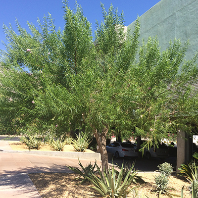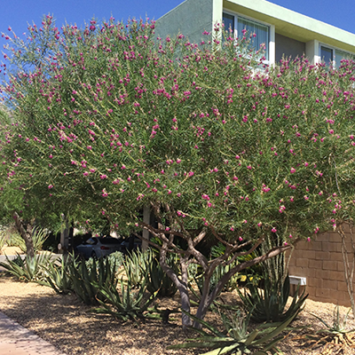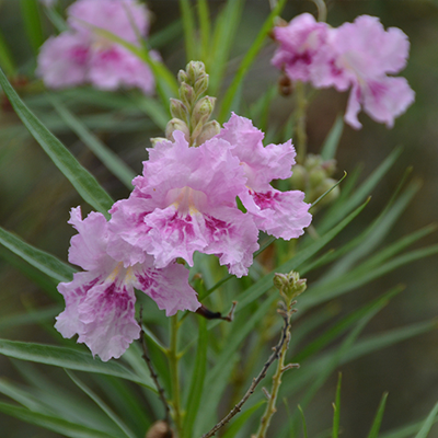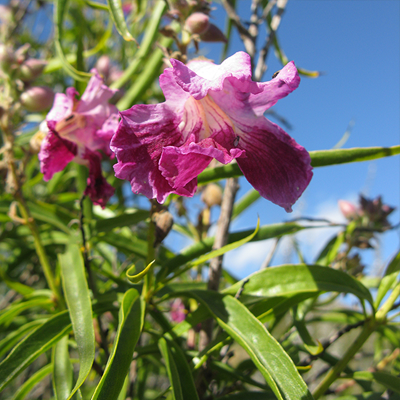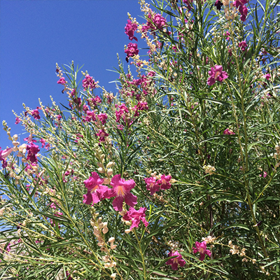 The Desert Willow (Chilopsis linearis) is a hardy tree that performs well in Southern California and requires minimal maintenance. Adapted to desert washes, it does best with just enough water to keep it blooming and healthily green through the warm months.