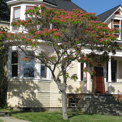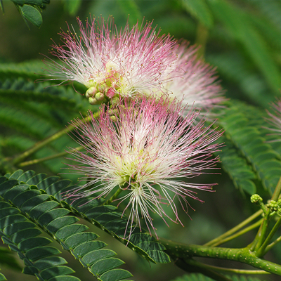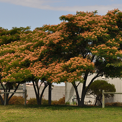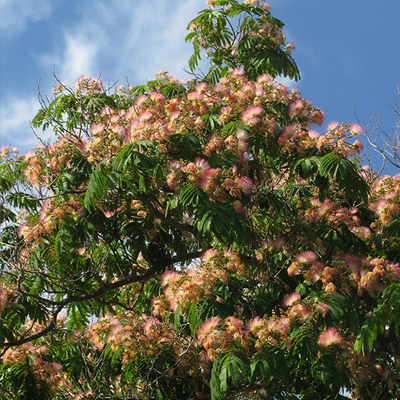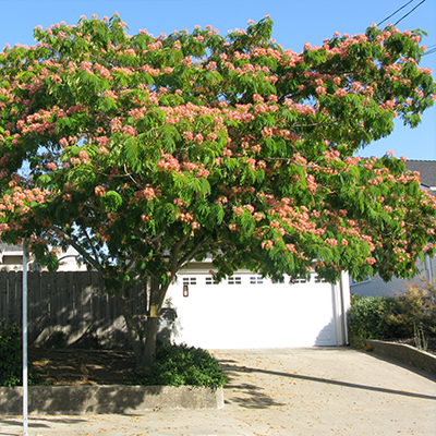 The Mimosa (Albizia julibrissin), also known as the Silk Tree, is a gorgeous flat-topped deciduous tree that brings a special rainforest effect to Southern California. The very hardy and heat loving Mimosa is ideal wherever a full, dense canopy is desired during the summer months.